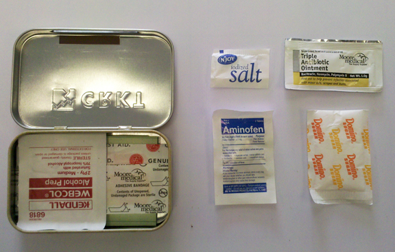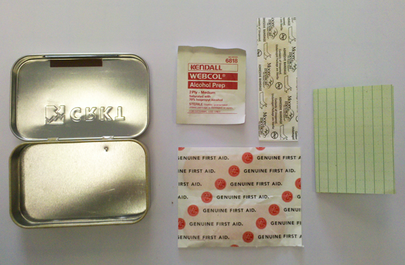 Below is a step by step photo gallery and ‘ingredients list’ for a sample Candy Tin Survival Kit. I would expect that the contents of your own kit will vary depending upon your priorities and lifestyle. That’s OK.